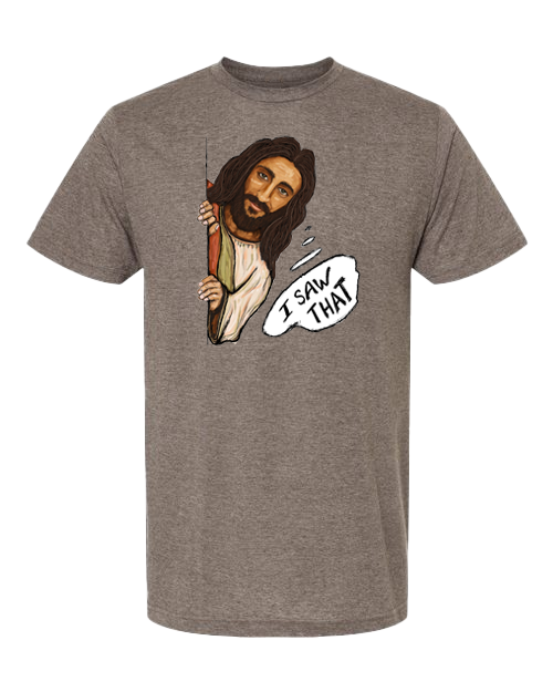 Subtle? Not even a little. This shirt’s got Jesus himself leaning in from the sidelines. He’s just caught you in the act (what that act is, who’s to tell?) and offers a raised brow and a speech bubble that says, “I Saw That.” It brings a bit of that Sunday School guilt trip into your modern life, perfect for when you want to keep people guessing whether you’re joking… or not.